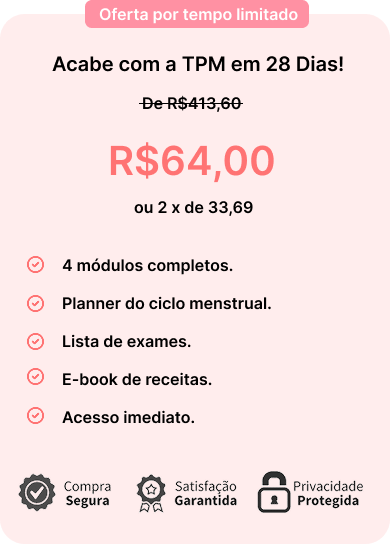 Descubra como nosso curso digital ensina soluções naturais para aliviar os sintomas da TPM e recuperar sua energia. Em apenas 28 dias, você conquista mais equilíbrio emocional e físico de forma simples e acessível.